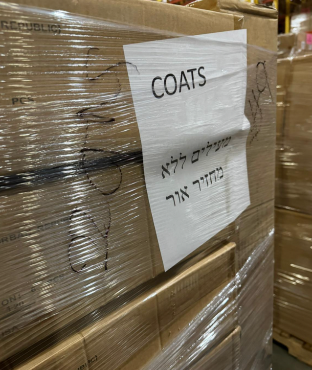 Include a packing list (link to PDF below) on the outside of each pallet (in English and Hebrew if possible).